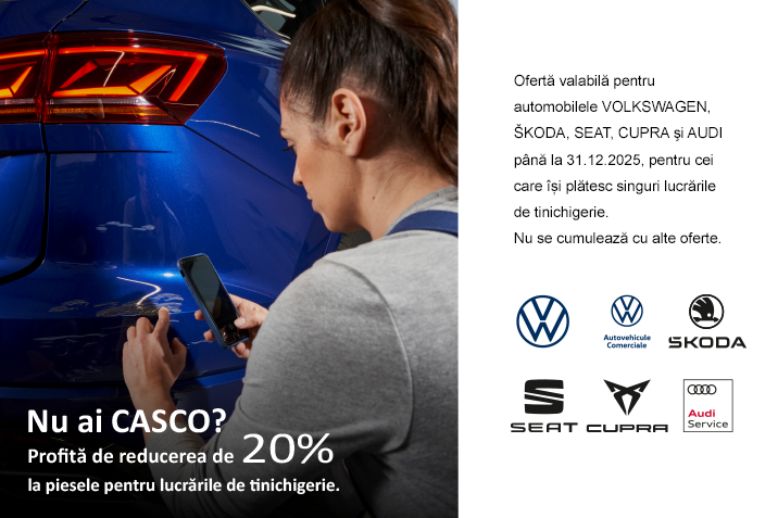 “Pentru cei care isi platesc singuri lucrarile de tinichigerie, oferim o reducere de 20% la piesele necesare! Oferta este valabila pentru automobilele Volkswagen, Skoda, Seat, Cupra si Audi pana la finalul anului 2025. Profita acum!”